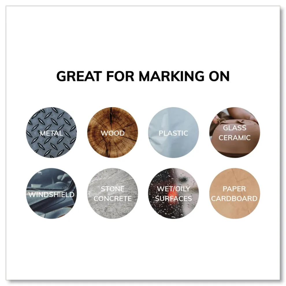 Create opaque and glossy marks on virtually any surface: metal, glass, wood, rubber, concrete, plastic and more