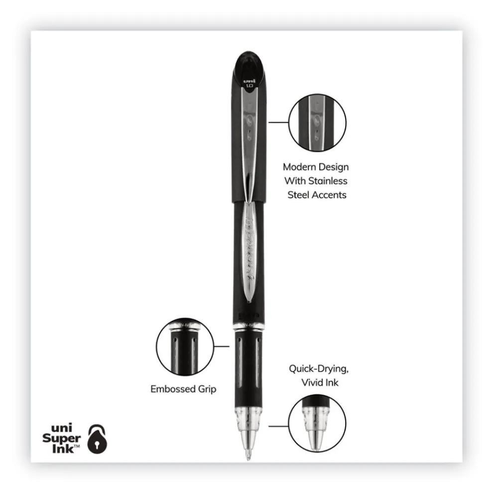 Write with greater speed and efficiency using JETSTREAM Ballpoint Stick Pens from uni-ball. The pens deliver an incredibly fast, clean writing experience that helps you jot down your thoughts and ideas quickly. Combining the silky smoothness and vivid vibrancy of a gel pen with the fast-drying efficiency of a ballpoint, these JETSTREAM ballpoint pens offer the best of both worlds. Quick-drying ink resists smudges and smears, making this pen suitable for left-handed writers. An embossed grip offers better control when writing, while contemporary stainless steel accents offer a stylish appeal. JETSTREAM stick pens feature pigment-based uni Super Ink technology that settles deep into the paper, offering three-way protection against fraud, fading and water.