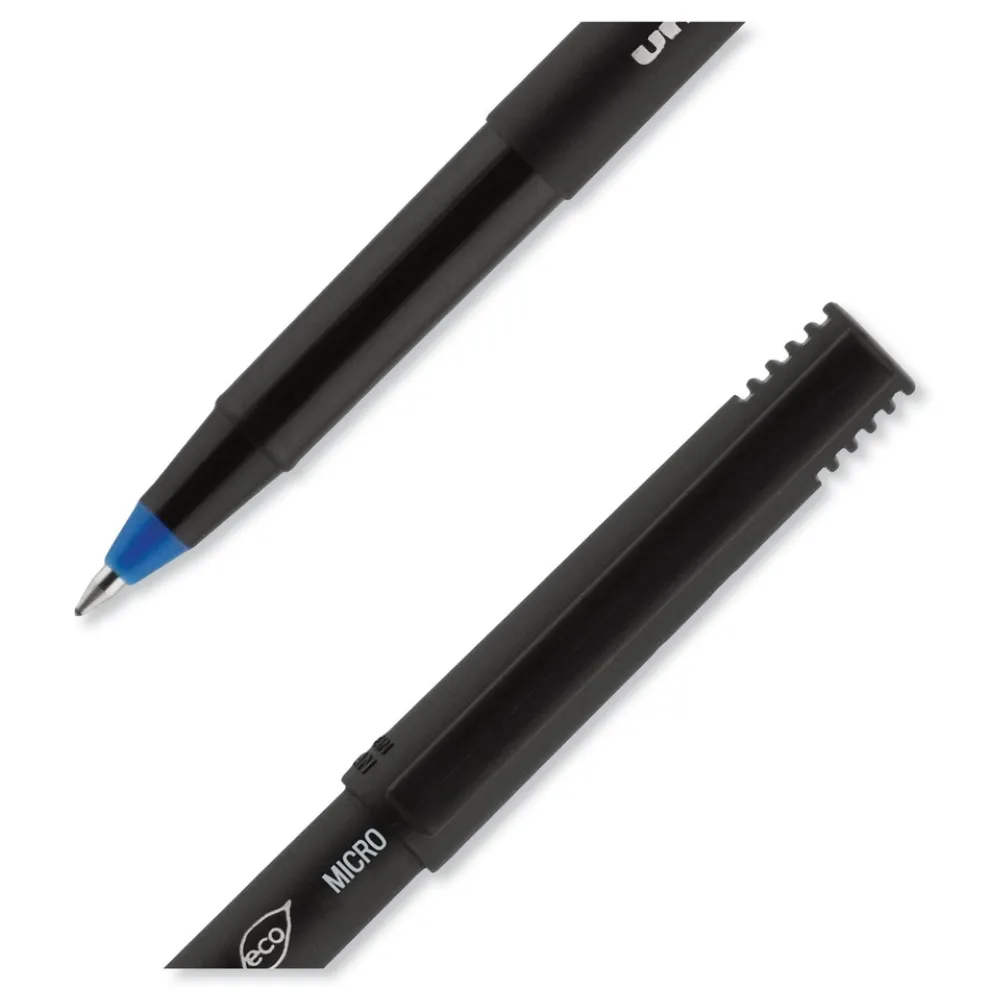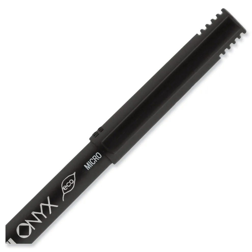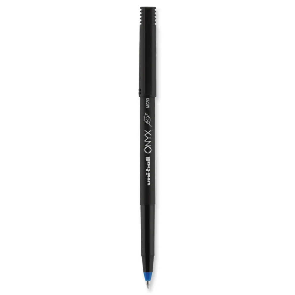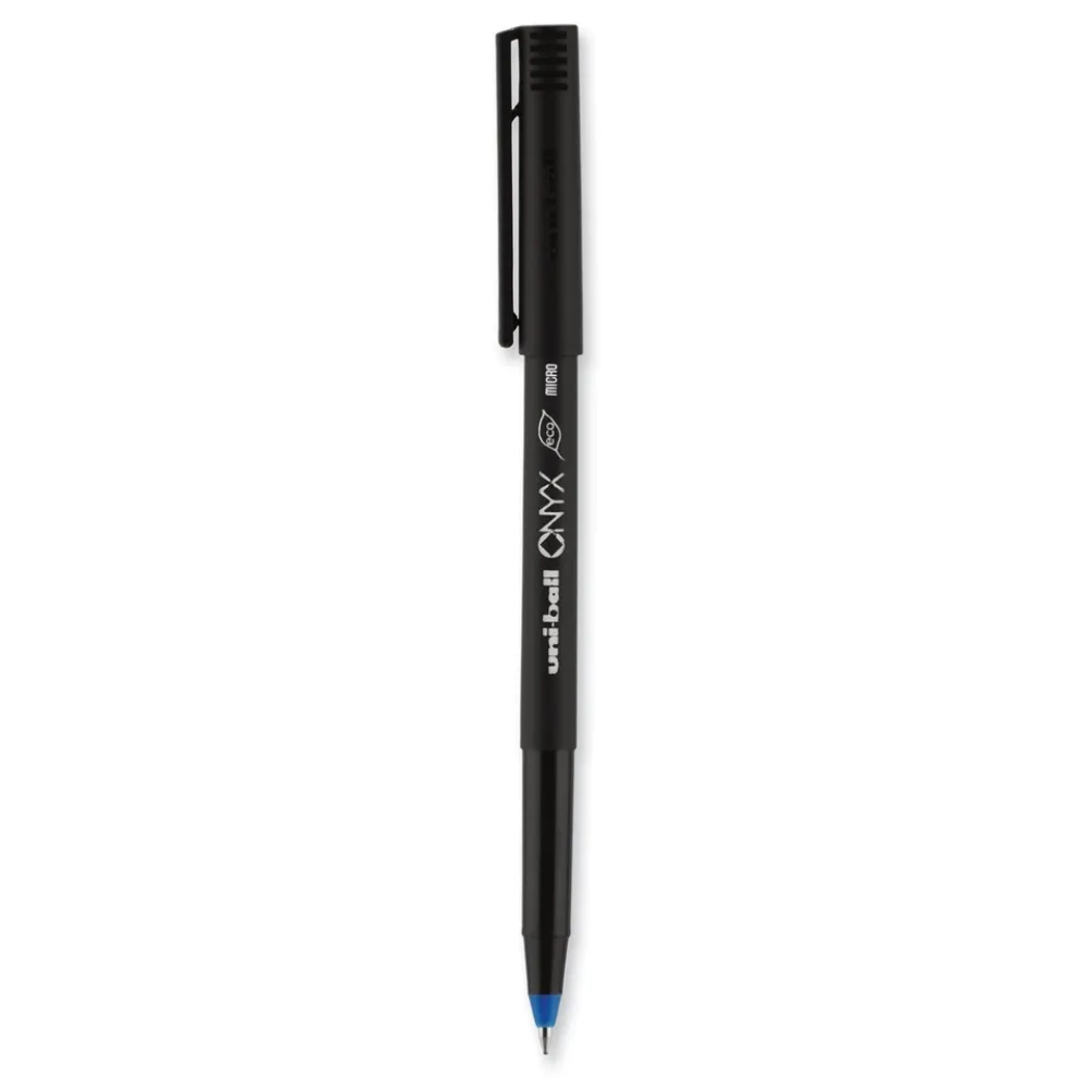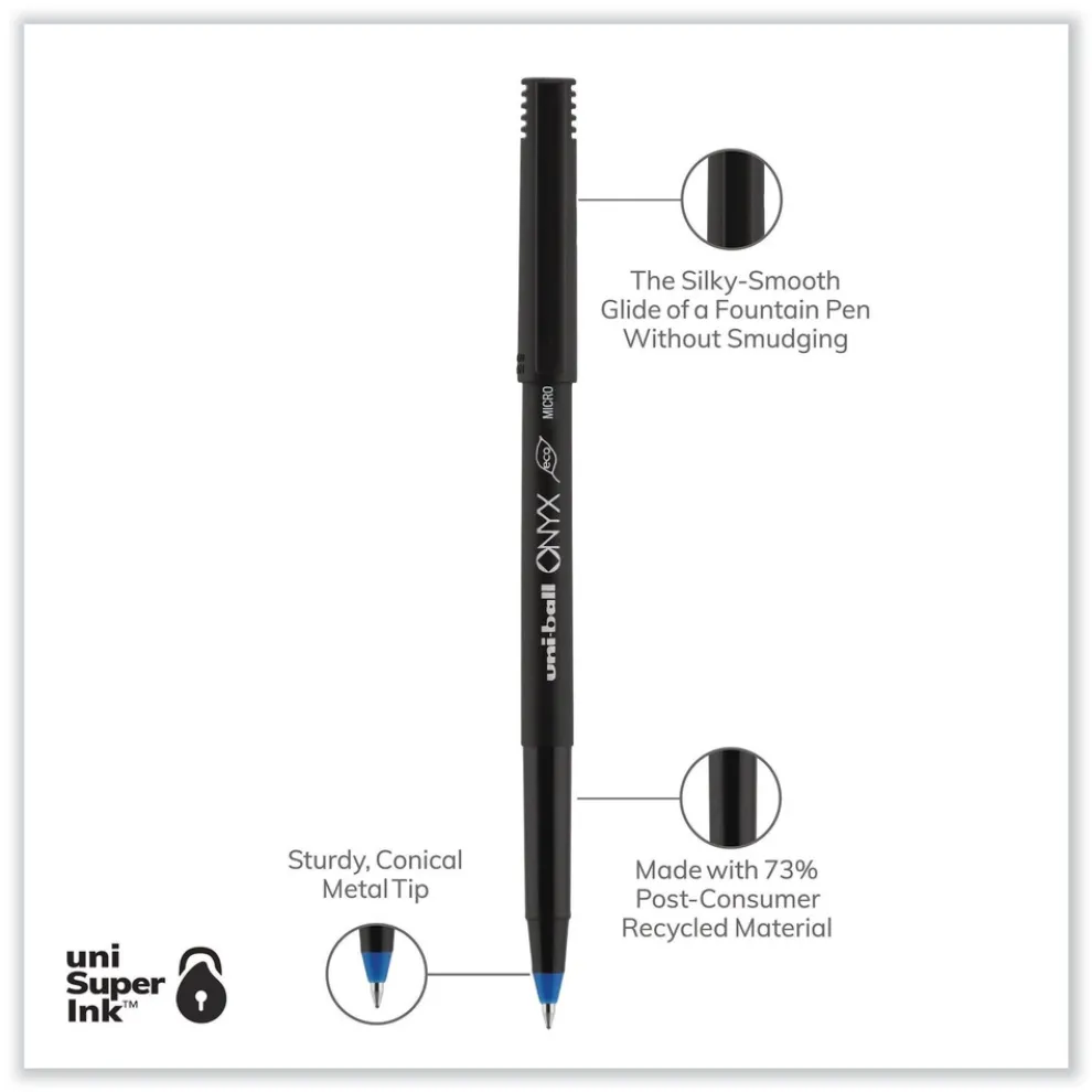 Stock your office, home or classroom with Onyx Rollerball Stick Pens from uni-ball featuring strong, long lasting tip sizes. This rollerball pen delivers the silky-smooth glide of a fountain pen without smudging for effortless writing. ONYX pens produce crisp and precise lines for intricate writing, making it easy to create super fine details in your drawings and diagrams. Capped roller pens are useful for a variety of tasks from note taking to signing checks and legal documents to uniquely embellishing fun and creative writing projects. Innovative uni Super Ink technology forms a strong bond with the paper, protecting from water, fading and fraud. A great economic and environmentally-conscious choice as this super sleek micro point roller pen is made from post-consumer recycled material.
