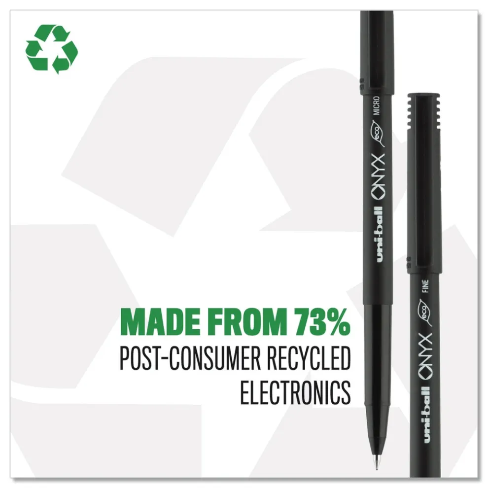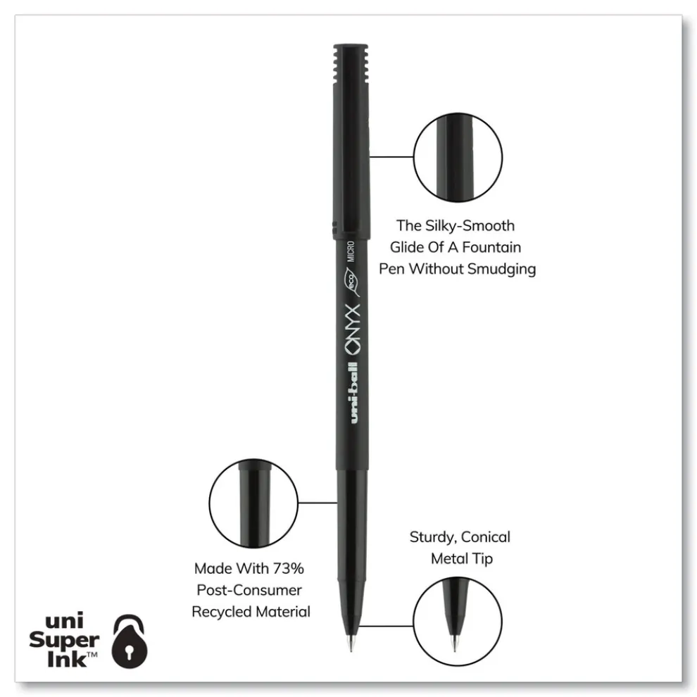 Stock your office, home or classroom with Onyx Rollerball Stick Pens from uni-ball featuring strong, long lasting tip sizes. This rollerball pen delivers the silky-smooth glide of a fountain pen without smudging for effortless writing. ONYX pens produce crisp and precise lines for intricate writing, making it easy to create super fine details in your drawings and diagrams. Capped roller pens are useful for a variety of tasks from note taking to signing checks and legal documents to uniquely embellishing fun and creative writing projects. Innovative uni Super Ink technology forms a strong bond with the paper, protecting from water, fading and fraud. A great economic and environmentally-conscious choice as this super sleek micro point roller pen is made from post-consumer recycled material.