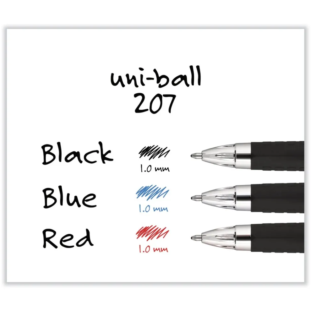 Stock your office, home or classroom with 207 Retractable Gel Pens from uni-ball available in various point sizes with a stainless steel tip that resists bending and breaking. Even-flowing, pigment-based gel ink delivers a smooth writing experience for intense, vibrant lines, ensuring that every mark is brilliantly communicated. Use these retractable gel pens for everyday writing tasks, check signing and all of your important signatures, trusting its quick-drying uni Super Ink. Innovative uni Super Ink technology effectively entraps the gel ink into the paper, producing fraud, fade and water-resistant documents that resist check washing or bleaching. A textured grip offers greater comfort and control as you continue writing, while a translucent ink window indicates the level of gel ink remaining, so you don’t run out unexpectedly. The sleek design of the 207 with modern metal accents gives the retractable gel pen a stylish touch.