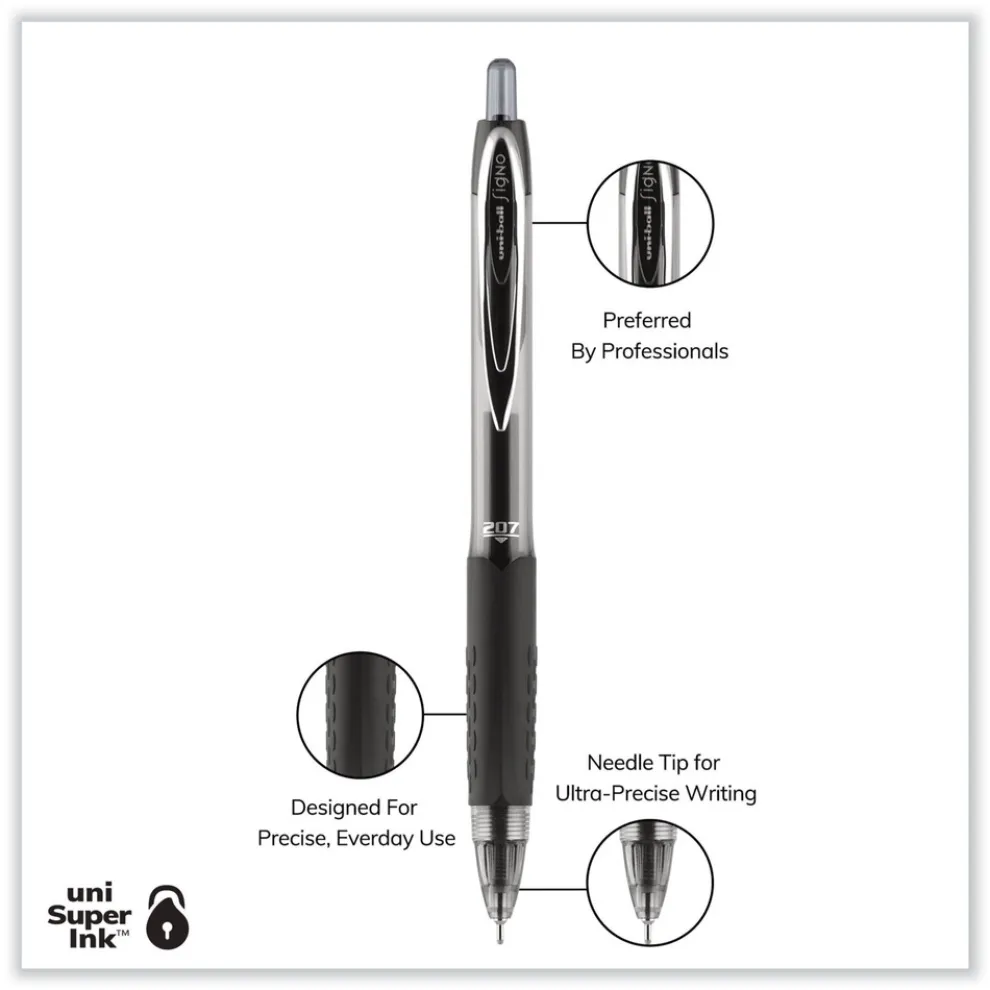 Stock your office, home or classroom with 207 Needle Retractable Gel Pens from uni-ball featuring a 0.7 mm medium point. These needle point pens are designed with a bend resistant tip for better accuracy. Even-flowing, pigment-based gel ink delivers a smooth writing experience for intense, vibrant lines, ensuring that every mark is brilliantly communicated. Use these retractable gel pens for everyday writing tasks, check signing and all of your important signatures, trusting its quick-drying uni Super Ink. Innovative uni Super Ink technology effectively entraps the gel ink into the paper, producing fraud, fade and water-resistant documents that resist check washing or bleaching. The 0.7 mm medium needle point allows you to create ultra-precise, straight edge lines with ease. A textured grip offers greater comfort and control as you continue writing, while a translucent ink window indicates the level of gel ink remaining, so you don’t run out unexpectedly. The sleek design of the 207 with modern metal accents gives the retractable gel pen a stylish touch.