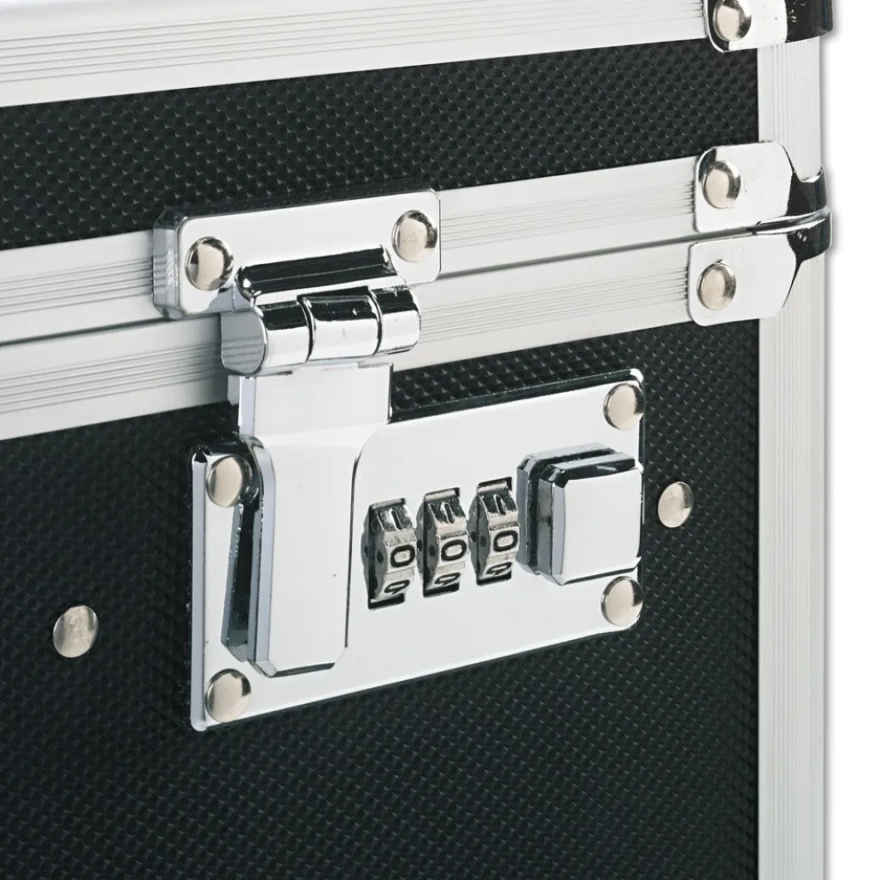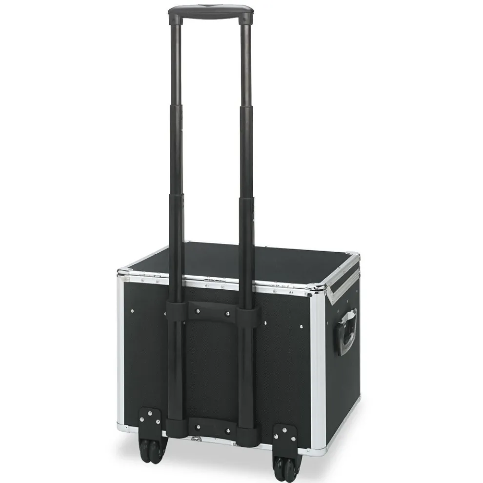 Telescopic handle and sturdy wheels give you easy mobility while two combination locks provide added security. Built-in rails accommodate two hanging file sizes. Panels are made of diamond-embossed PVC. Features chrome label holder plate, chrome corners and aluminum trim. Telescopic handle extends to 32 in. Also includes side handles. Front stoppers provide level placement.