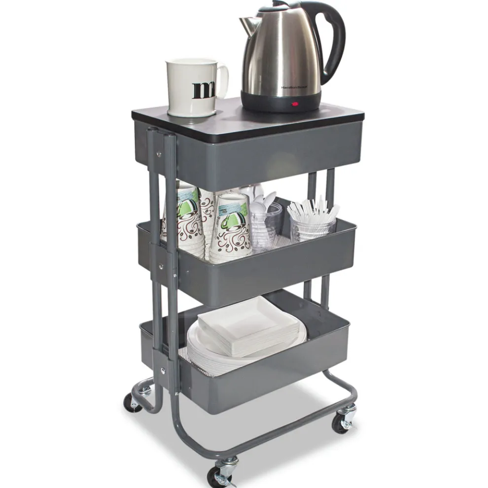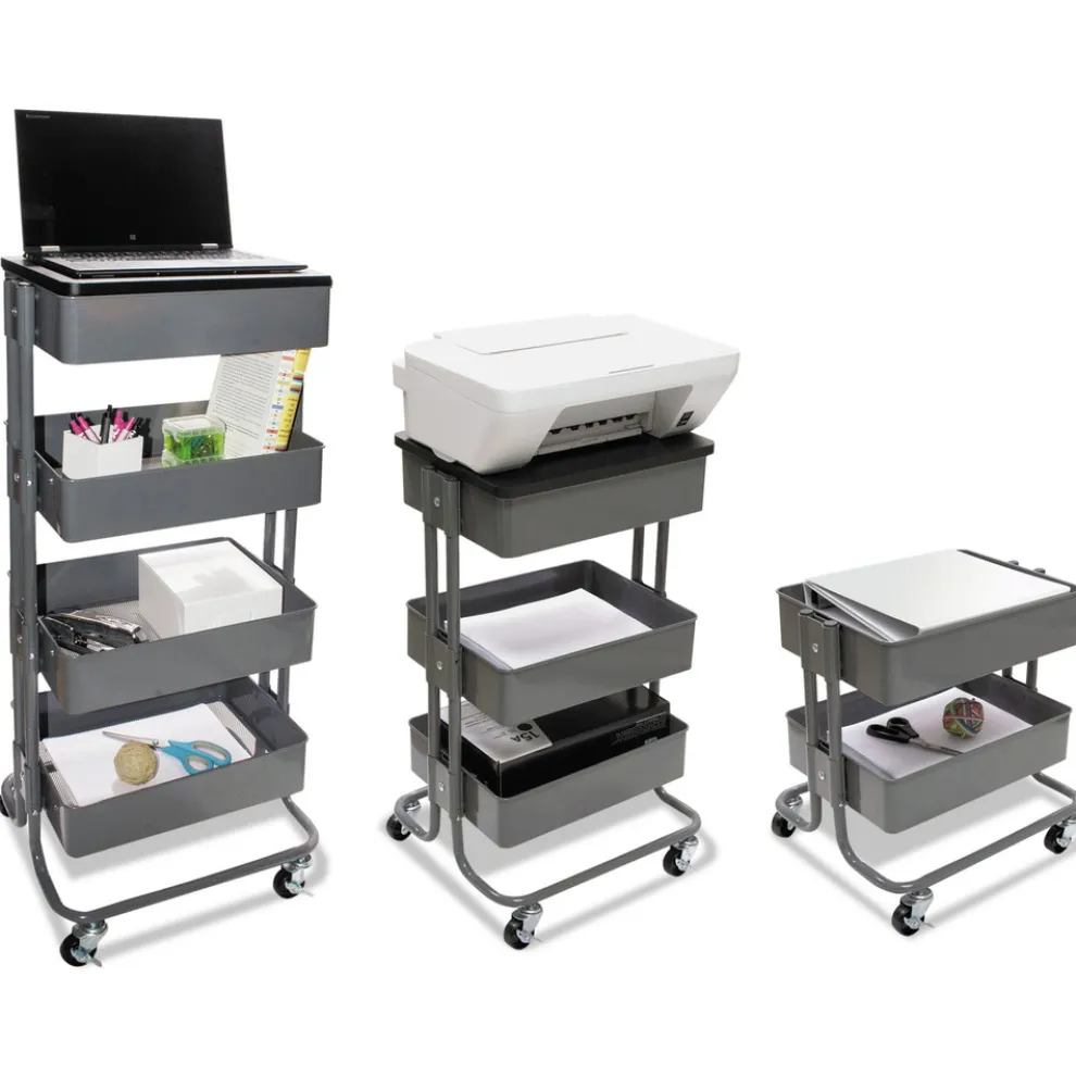 Build your own desk space with this versatile workstation and storage cart by Vertiflex. Heavy-duty, metal construction with a removable MDF top tray. Center two baskets are adjustable in height, providing 3 different variations. Can be configured with four baskets as a standing laptop station, three baskets for deskside storage, or two baskets for under-desk use. Rolls smoothly on four casters, two locking. Fully assembled dimensions: 15.25 x 11.25 x 39.