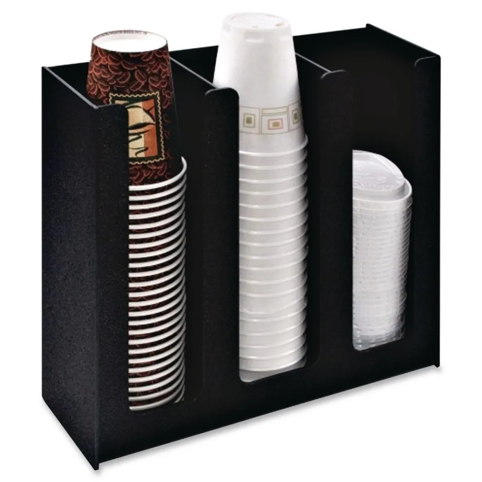 The perfect breakroom addition, provides easy access to cups and lids. Three 11.75″ high columns hold cups from 8-oz to 32-oz size. Nonskid tabs on base keep cup holder secure on counter. Commercial-grade construction will not crack, fade or chip. Includes compartment identifier decals.