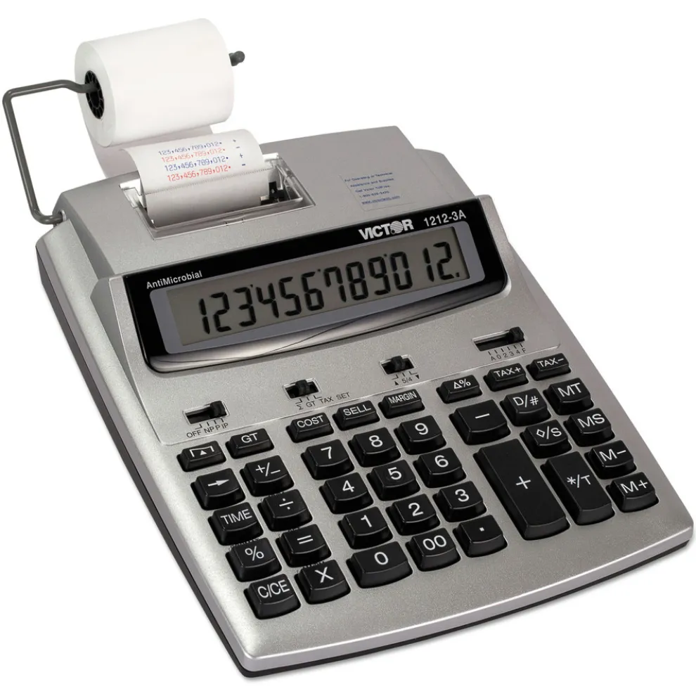 Victor 12 digit commercial printing calculator with an extra large LCD display which shows individual entries and running subtotals. Contemporary silver and black styling. Engineered with an antimicrobial agent that reduces the growth of microbes and bacteria on the product that can cause discoloration and odors. Manufactured with recycled plastic. The 1212-3A features ink-roller printing, constants in multiplication and division, percentage add-on and discount. Change sign key, large add and subtract keys. Nonprint or print mode. Item count. Full decimal settings. Non-add/date key. Markup and selectable rounding. Four-key independent memory. Operates on (4) AA batteries (not included) or on the included AC adapter.