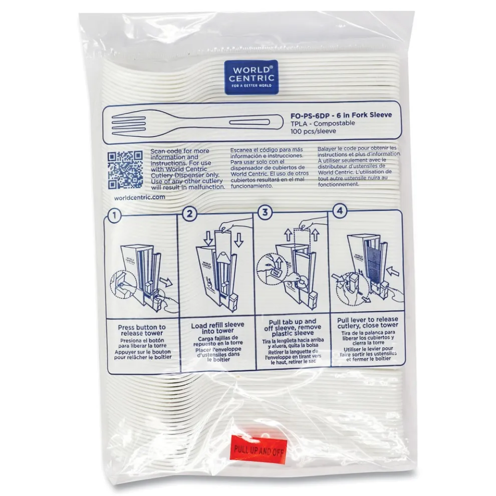 Specially designed compostable TPLA cutlery for use in World Centric’s innovative touchless cutlery dispenser for a clean, easy way to access utensils. Touch-free handling and refilling of cutlery sleeve prevents contamination. Easy refilling with simple instructions on cutlery refill bags and refill indicators. Minimizes waste since users take only the individual pieces of cutlery they need. Use with World Centric cutlery dispenser DPBAFKS. Cutlery made of talc-injected non-GMO corn-derived polylactic acid (TPLA) – get all the benefits of disposable plastic cutlery without the downside. Sturdy and reliable with enhanced hardness and rigidity. Excellent temperature range – ideal for serving both cold and hot foods up to 180 degrees F. Reusable and dishwasher-safe. Compostable in a commercial composting facility; facilities may not exist in your area.