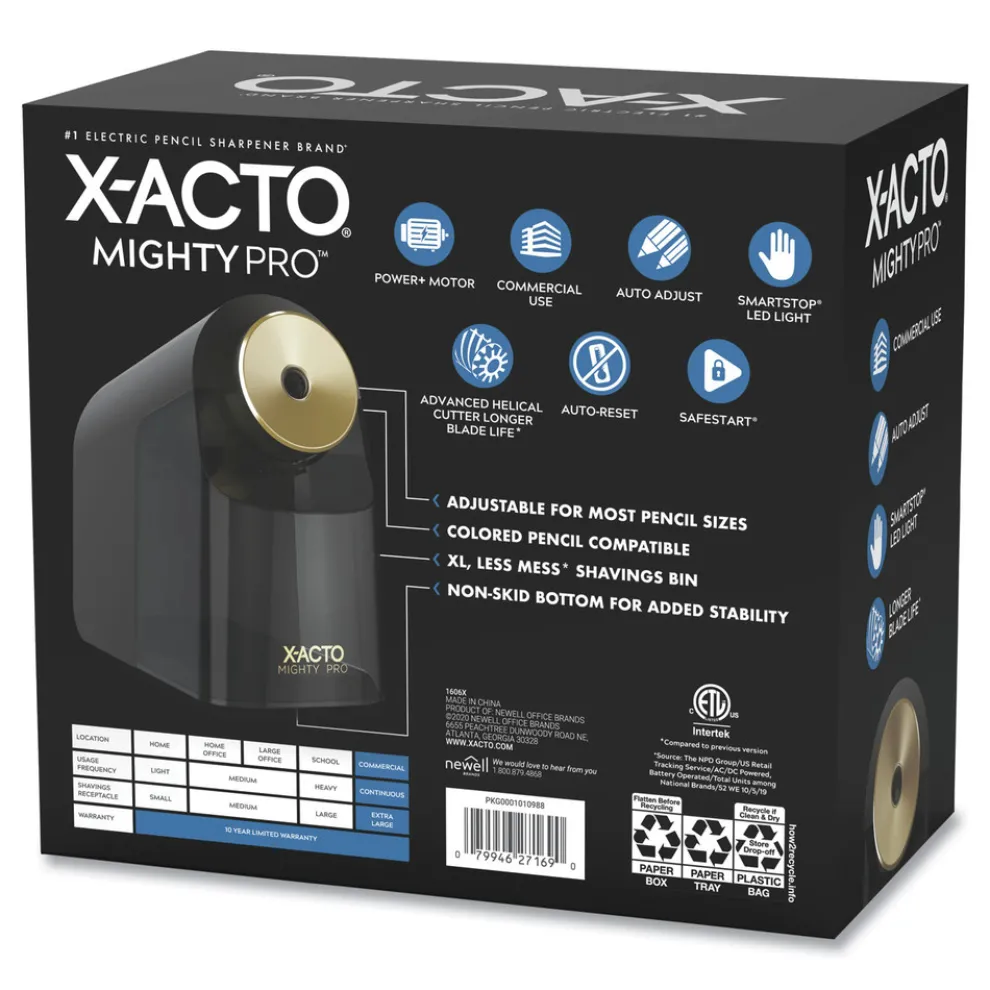 The fastest electric pencil sharpener from X-ACTO, the Mighty Pro sharpens woodcase pencils to a precise tip in no time. Break-resistant sharpening action ensures frustration-free operation. SmartStop prevents over-sharpening by automatically shutting off the motor when the pencil reaches ideal sharpness; and just to make sure, a bold LED lets you know when your pencil is ready to write. An auto-adjust dial seamlessly accommodates nearly any pencil size, while a slip-resistant bottom keeps the sharpener steady. SafeStart electric motor locks the blades in place when the extra-large, easy-to-empty shavings bin is removed. Compatible with colored pencils. Stay sharp with X-ACTO!